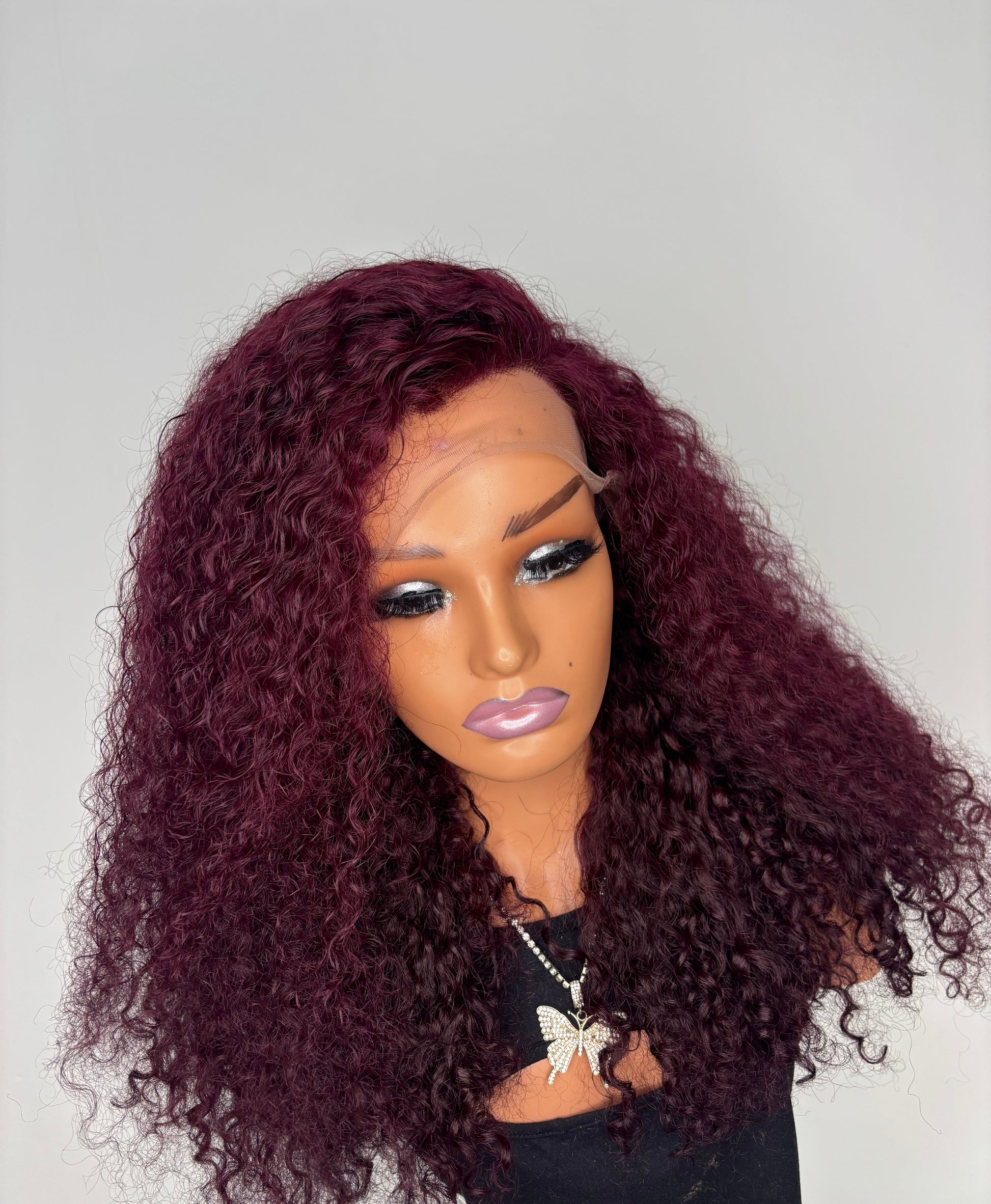 HD Lace Frontal Burgundy Curly Wig, made from 100% Super Double Drawn Human Hair. The deep burgundy hue adds a bold yet elegant touch, while the luscious curls bring volume, bounce, and effortless glamour. Designed with ultra-thin HD lace, this wig blends seamlessly with your hairline for a natural, undetectable finish.